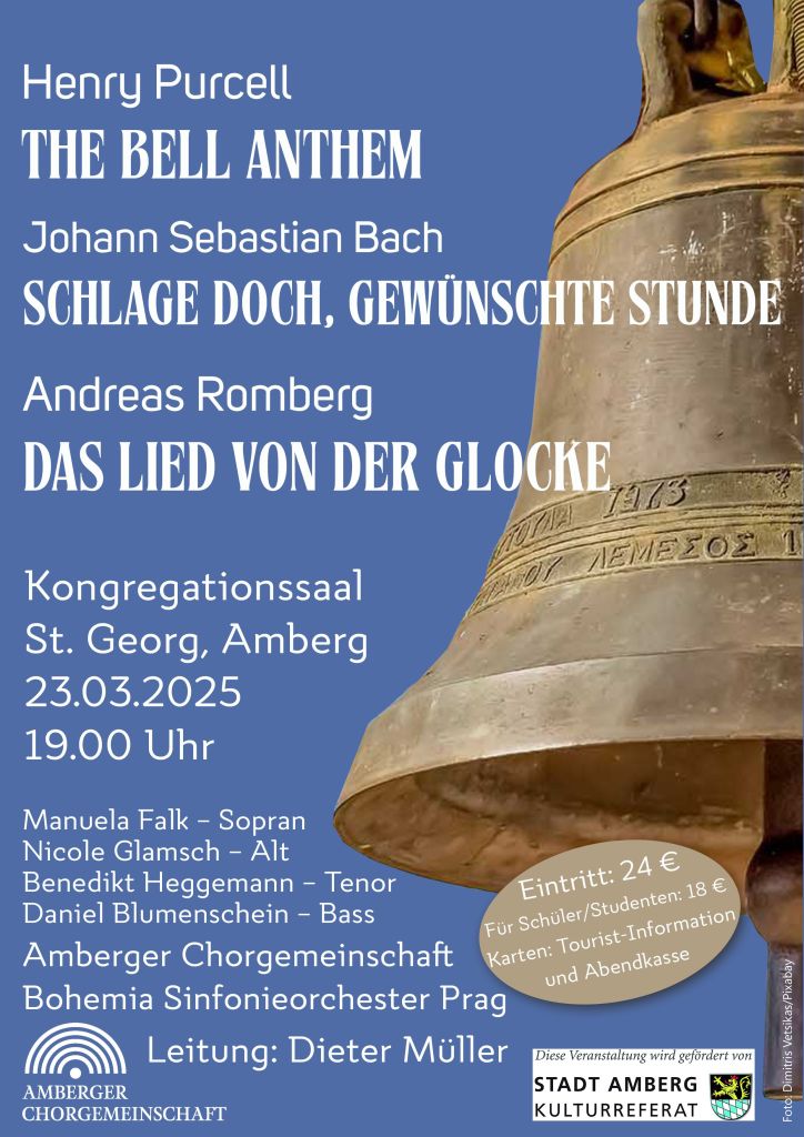 Das Bohemia Sinfonieorchester Prag, ein bewährtes Ensemble aus Profi-Musikern, das in ganz Europa gastiert, begleitet die Amberger Chorgemeinschaft und die Solisten, auch bei den zwei weiteren Werken dieses Programms, das durch das Thema „Glocke“ verbunden ist. Henry Purcells „Bell Anthem“ wurde so benannt, weil die Orchesterinstrumente in einer Passage das absteigende Geläut von englischen Kirchenglocken imitieren; eigentlich trägt es den Titel „Rejoice in the Lord alway“ („Freut euch im Herrn allezeit“). Das lange Zeit Johann Sebastian Bach zugeschriebene Werk „Schlage doch, gewünschte Stunde“ stammt, wie man inzwischen erforscht hat, von Bachs Zeitgenossen Georg Melchior Hoffmann, und hier sind im Orchester tatsächlich zwei Glocken vorgesehen.